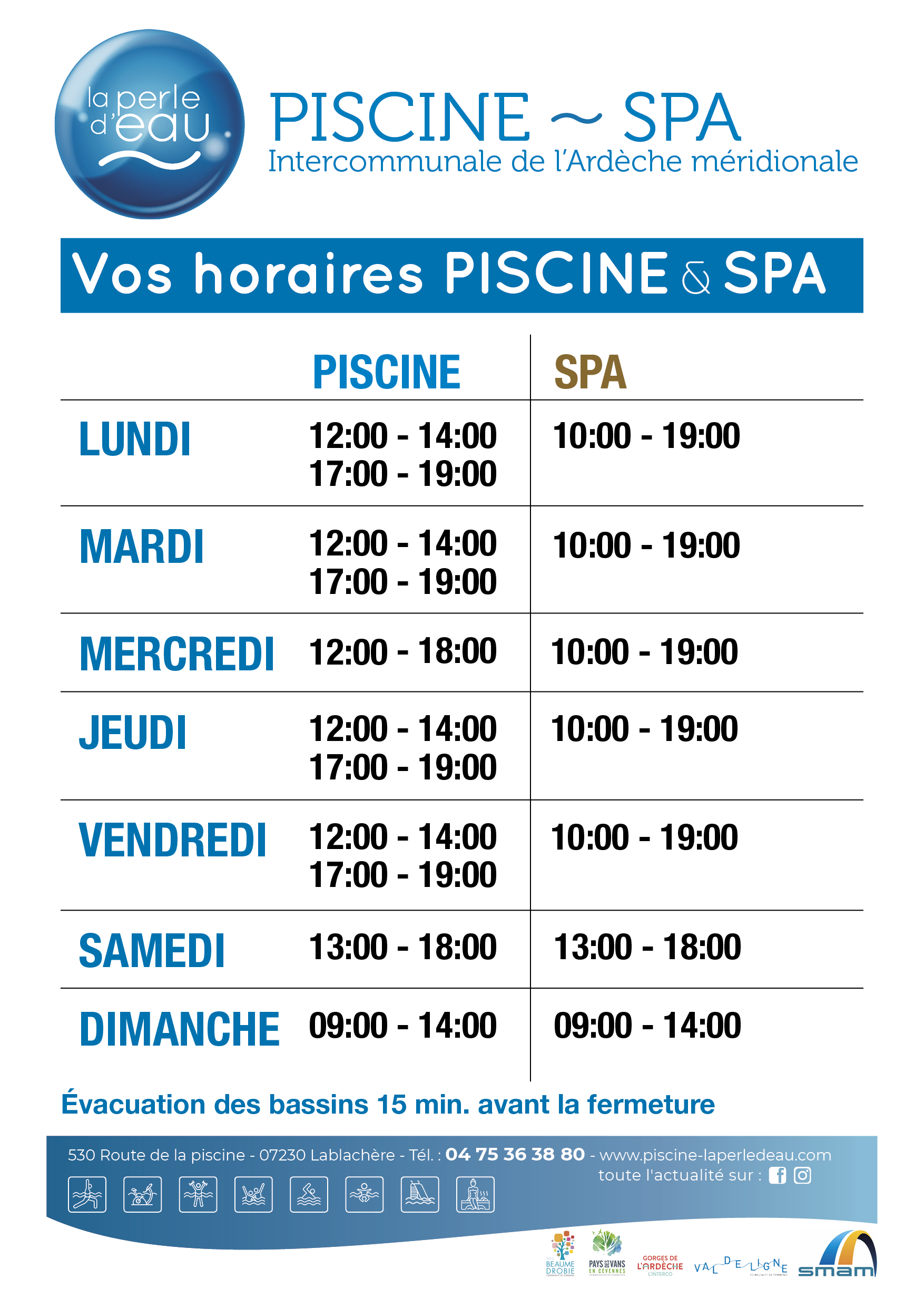 Piscine et Espace SPA ouverts toute l'année 7/7 (y compris les 14/07 et 15/08)