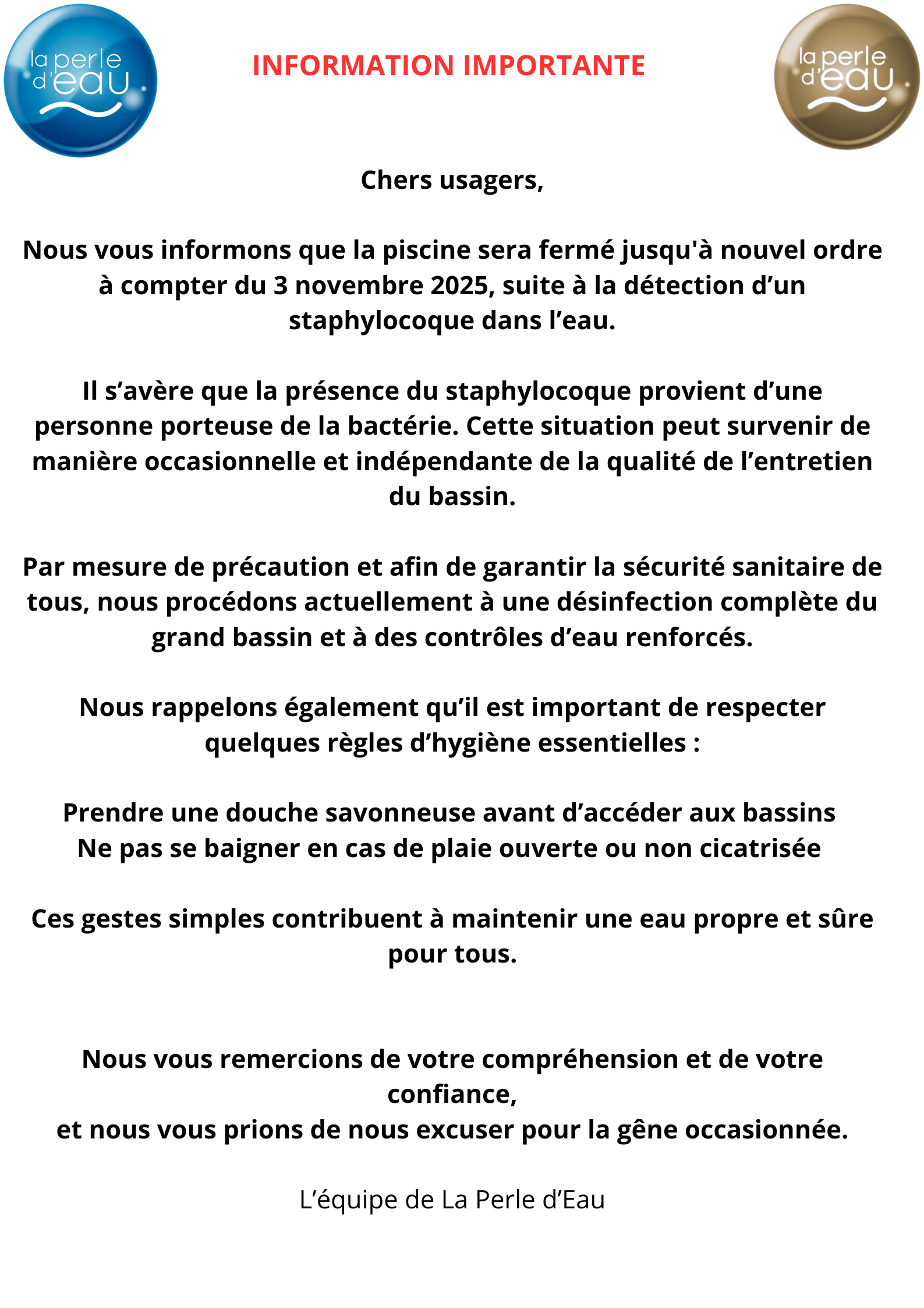 L’évacuation des bassins se fait un quart d’heure avant l’horaire de fermeture de la piscine.
